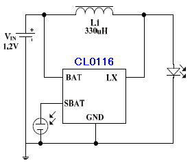 昇圧部をCL0116(昇圧IC)に変更。このICとインダクタンスL1は100均のソーラガーデンライトから流用する。改造部は前図のBO部を下図のQ3とL1に置き換える、改造により明るさが一定に維持されてる感じがする。 |