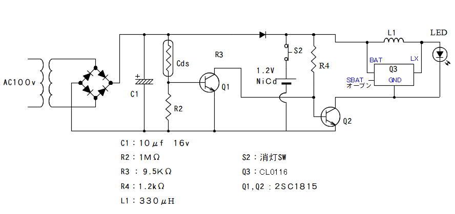 R1をCdsに置き換えR2を1MΩにする、Cdsは抵抗値が色々あるのでR2はトライアン ドトライで決める。本品は真っ暗にならないと点灯しない様に設定している。なお停電時は昼夜関係なく点灯するがダイオードを撤去すれば暗い時のみ点灯するようになる。 |