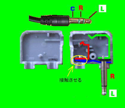 改造前の図でバネ電極の青と赤は絶縁されているがこれを接触させる、改造後の図の如くピンは撤去しRとLのみバネ電極に接する様にする、プラグのCスリーブはジャック側とは非接触にする。こうすることでR(右)とL(左)のイヤホンは直列に繋がり両耳で聞くことが出来る。