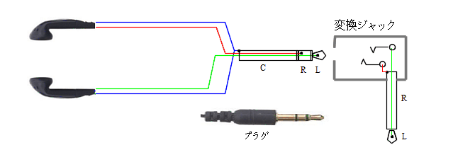 普通に考えれば左右のチャンネルのイヤホンを並列接続すれば出来るはずですが、実際にやってみると音が小さくなり,ボリュームを上げると音割れがして実用になりません。インピーダンスが崩れるのと並列により音が1/2になるためです。そこで直列接続を試みたところ何ら遜色なく音が出たので直列方式で変換ジャックを作ることにしました。