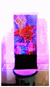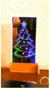 これは4枚の板を使い絵のパーツの色毎に板を使い分けています,すなわち1面は黄色、2面は赤、3面は緑、4面は青の絵を彫って4枚重ね、LEDも前記同様に1枚に1色ずつ投光しています、たとえば花は赤のみ投光しています。