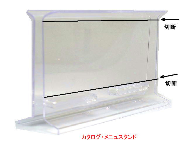 1)カタログ・メニュスタンドを上の写真の黒線部分を切断し厚2mmx幅90mmx長さ170mmのスチロール板を得る、このスタンドは二枚のパーツを長円形の凹凸部ではめ込ん組んであるので二枚に分離すれば切断し易く切断はオルファーPカッタープラ板用を使用する。