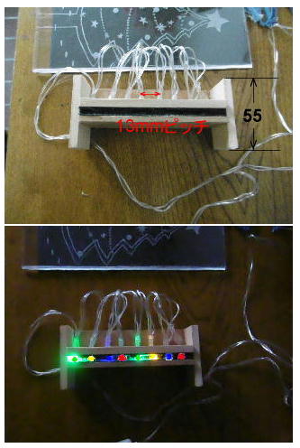 木枠の間隙にLEDを13mmピッチで並べる、描いたスチロール板を差し込む。