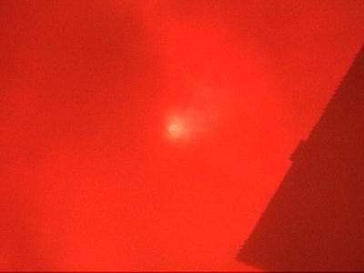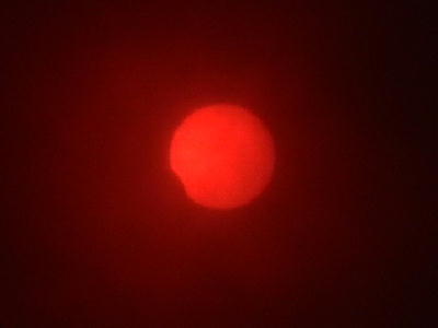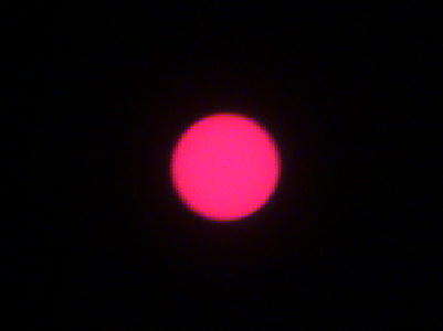 り取りレンズの上に置く(写真右)。覗くと赤色をしている。曇天には丁度よいが晴天では明る過ぎた。なお未感光の写真フイルムも試したが全く見えず使用出来なかった。その後のテストでビデオのオートアイリスをマニュアルにして絞りを調節すれば快晴でも上記の24日の太陽の如く綺麗に撮れた。 |