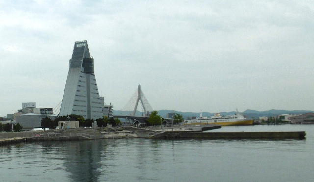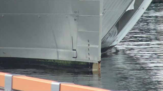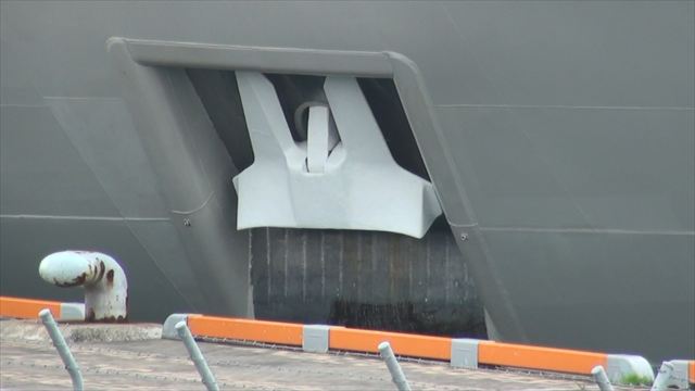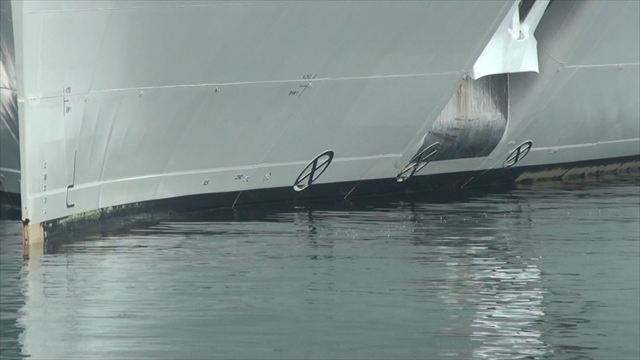 左はバルバス・バウ(Bulbous Bow)マーク(喫水線下の船首に設けた球状の突起)