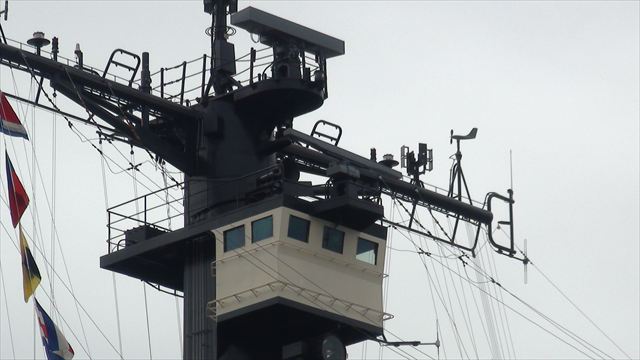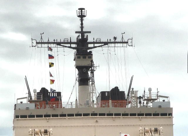 最上部にタカン空中線その下の箱状の水上レーダー、航海レーダーの順