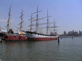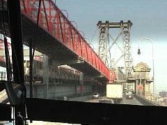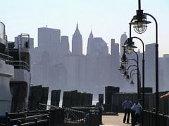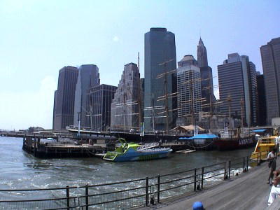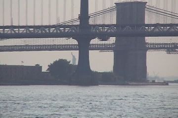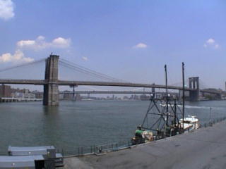 | 17番埠頭から眺めたブルックリン橋ですこの橋は石造りで1825m、1883年(明治16年)完成米国最古の吊り橋、1階は車専用で2階は人専用、イースト川をまたいでマンハッタンと九ブルックリンを結んでいます、その後方に見える橋はマンハッタン橋で、2,089 m1909年完成やはりマンハッタン島とブルックリンを結んでいます。上層に4車線の自動車道、下層に3車線の自動車道と4本の鉄道線路、歩行者通路、自転車通路があります。自動車と列車の両方を通すこうした吊り橋は、ニューヨーク市ではこの橋とマンハッタン橋だけです。 |