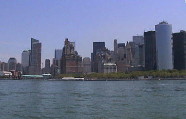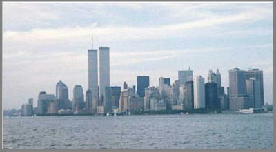 リバティー島から見るマンハッタンの景色、 右はワールドトレードセンタービルがありし頃の資料写真
