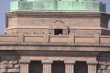 | 自由の女神は1886年アメリカの独立100周年と、アメリカ・フランスの友好を記念して贈られた像です。台座部分にはエレベータが設置されていて。かつてエレベータの最上階(10階)からは像の中の階段を上って頭頂部は展望台に登ることができたましたが現在はテロ警戒のため閉鎖されていて内部への見学は台座部分のみ予約制になっています。トーチ(たいまつ)から台座部分も含めると高さ93メートルあります。右手は純金のトーチ(たいまつ)を空高く掲げ、左手にはアメリカ合衆国の独立記念日である「1776年7月4日」とローマ数字で刻印されている銘板を持ち足元には引きちぎられた鎖と足かせがあり、これを女神が踏みつけています。全ての弾圧からの解放と人類の平等であることを象徴しています。女神の王冠には7つの突起があり7つの大陸と7つの海に自由が広がるという意味です。 |